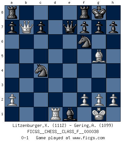 Last move : 0-1 2007 May 11 18:24:23 [Event "FICGS__CHESS__CLASS_F__000038"] [Site "FICGS"] [Date "2007.05.09"] [Round "1"] [White "Litzenburger,Xavier"] [Black "Gering,Adrien"] [Result "0-1"] [WhiteElo "1112"] [BlackElo "1099"] 1.e4 e5 2.Nf3 Nc6 3.Bc4 Bc5 4.b4 Bxb4 5.c3 Ba5 6.O-O Nf6 7.d4 exd4 8.cxd4 O-O 9.Bg5 d6 10.Nc3 Bxc3 11.Rc1 Ba5 12.Qe2 Bg4 13.e5 Bxf3 14.Qxf3 dxe5 15.dxe5 Nxe5 16.Qxb7 Nxc4 17.Rcd1 Qe7 18.Rfe1 Bxe1 0-1 Evans gambit Kingside Castling by player White (move 6) Kingside Castling by player Black (move 8) Player Black won this chess game. Follow this game move after move (download)I prefer to lose a really good game than to win a bad one. (David Levy) Die Partien sind immer verschieden, die Interviews immer die gleichen. (Garry Kasparov) Cuando me preguntan: -¿Cual es el secreto que te hace hacer mejores movidas que tus oponentes?, Yo respondo: Me da gusto que me pregunten eso, porque, como veran, hay una simple razón. Yo pienso mis propias movidas y dejo a mi oponente que el piense las suyas. (Alexander Alekhine) Les ravages du H expliquent la différence de niveau entre Tal et Thal [Abergel]. Art disturbs, science reassures. (Georges Braque, Le Jour et la Nuit)