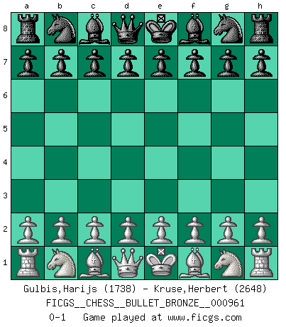 Last move : 0-1 2018 May 31 23:26:34 [Event "FICGS__CHESS__BULLET_BRONZE__000961"] [Site "FICGS"] [Date "2018.05.31"] [Round "1"] [White "Gulbis,Harijs"] [Black "Kruse,Herbert"] [Result "0-1"] [WhiteElo "1738"] [BlackElo "2648"] 0-1 This chess game has been lost on time (started : 2018.05.31 22:46:50) Player Black won this chess game. Follow this game move after move (download)I play correspondence chess because it is both art and science while chess is art only. (A player at FICGS) Die jungen Leute sollen verstehen, dass sie noch etwas von mir lernen können und müssen. (Viktor Kortschnoi) Mis oponentes también hacen buenas movidas. A veces yo no tomo esas cosas en consideración. (Bobby Fischer) Il vaut toujours mieux jouer un plan faux de façon logique que de n'avoir pas de plan du tout. (Victor Kortchnoï) Those parts of the system that you can hit with a hammer (not advised) are called hardware; those program instructions that you can only curse at are called software. (Anonymous)