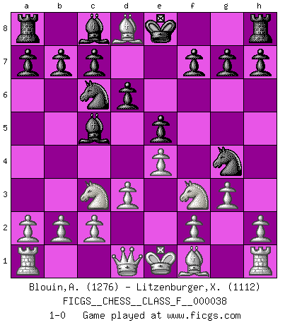 Last move : 1-0 2007 May 17 14:39:56 [Event "FICGS__CHESS__CLASS_F__000038"] [Site "FICGS"] [Date "2007.05.09"] [Round "1"] [White "Blouin,Aaron"] [Black "Litzenburger,Xavier"] [Result "1-0"] [WhiteElo "1276"] [BlackElo "1112"] 1.e4 e5 2.Nf3 Nc6 3.Nc3 Bc5 4.d3 d6 5.Bg5 Nf6 6.g3 Ng4 7.Bxd8 1-0 Three knights game Player White won this chess game. Follow this game move after move (download)If your opponent cannot do anything active, then don't rush the position; instead you should let him sit there, suffer, and beg you for a draw. (Jeremy Silman) Ich bin der einzige Schachspieler, der sich während der Vorbereitungen zum Turnier verletzt hat. (Woody Allen) Haz el enroque temprano y seguido. (Rob Sillars) Pour se monter efficace, un Cavalier a besoin d'avant-postes ! Les Cavaliers font les meilleurs bloqueurs de pions passés. The project of the man are lower than those of the sky. (Chinese proverb)