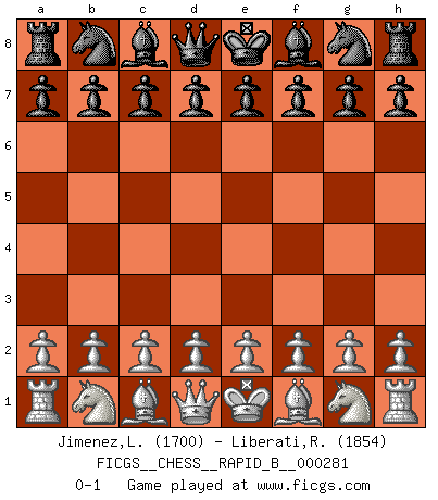 Last move : 0-1 2018 July 2 17:37:2 [Event "FICGS__CHESS__RAPID_B__000281"] [Site "FICGS"] [Date "2018.06.02"] [Round "1"] [White "Jimenez,Luisfer"] [Black "Liberati,Riccardo"] [Result "0-1"] [WhiteElo "1700"] [BlackElo "1854"] 0-1 This chess game has been lost on time (started : 2018.06.02 14:10:27) Player Black won this chess game. Follow this game move after move (download)Of all my Russian books, the defense contains and diffuses the greatest 'warmth' which may seem odd seeing how supremely abstract Chess is supposed to be. (Vladimir Nabokov) Ein Schachspiel besteht aus drei Phasen: Die erste, wenn du hofftst den Vorteil zu haben, die zweite, wenn du glaubst einen Vorteil zu haben, und die dritte.... wenn du weißt Du wirst verlieren. (Savielly Grigorievitsch Tartakower) Tu puedes aprender mucho mas de una partida que pierdas que de una partida ganada. Tendras que perder cientos de partidas antes de llegar a ser un buen jugador. (Jose Raul Capablanca) Mais n'est-ce pas déjà le limiter injurieusement que d'appeler les échecs un jeu? N'est-ce pas aussi une science, un art, ou quelque chose qui, comme le cercueil de Mahomet entre ciel et terre, est suspendu entre l'un et l'autre, et qui réunit un nombre incroyable de contraires ? (Stefan Zweig) A computer lets you make more mistakes faster than any invention in human history - with the possible exceptions of handguns and tequila. (Mitch Ratcliffe)
