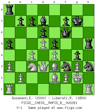 Last move : 0-1 2018 July 3 11:34:8 [Event "FICGS__CHESS__RAPID_B__000281"] [Site "FICGS"] [Date "2018.06.02"] [Round "1"] [White "Gossmann,Ewald"] [Black "Liberati,Riccardo"] [Result "0-1"] [WhiteElo "2000"] [BlackElo "1854"] 1.d4 Nf6 2.c4 e6 3.Nc3 Bb4 4.e3 O-O 5.Bd3 d6 6.Nge2 e5 7.O-O Re8 8.a3 Bxc3 9.Nxc3 a5 10.h3 h6 11.Bc2 Nc6 12.d5 Ne7 13.e4 Ng6 14.Kh2 Nf4 15.Qf3 g5 16.Qd1 Kh8 17.Be3 g4 18.g3 Nxh3 19.Bxh6 Nh7 20.Kg2 Qf6 21.Be3 Kg7 22.Bd3 Rh8 23.Rh1 N7g5 24.Be2 Bd7 25.Qd2 Nf3 26.Qd3 Rh5 0-1 Nimzo-Indian : 4.e3 O-O, 5.Bd3 Kingside Castling by player Black (move 4) Kingside Castling by player White (move 7) Player Black won this chess game. Follow this game move after move (download)Chess, like love, is infectious at any age. (Flohr) Sie bekommen vielleicht den Eindruck, dass die Spitzenspieler überhaupt gar nicht so stark sind. Aber das stimmt nicht. Es ist eine Illusion. Mit einem Computer an der Seite ist es sehr leicht, Urteile zu fällen, aber wenn man alleine am Brett sitzt, sieht die Sache ganz anders aus. (Vladimir Kramnik) Puntos débiles o agujeros en la posición de tu oponente deben de ser ocupados por piezas, no Peones. (Siegbert Tarrasch) Je fais ceci parce que dans cinquante coups j'obtiendrai cela; je m'appelle Mikhail Moisevitch Botvinnik. (Botvinnik) The meaning of life is that it is to be lived, and it is not to be traded and conceptualized and squeezed into a pattern of systems. (Bruce Lee)