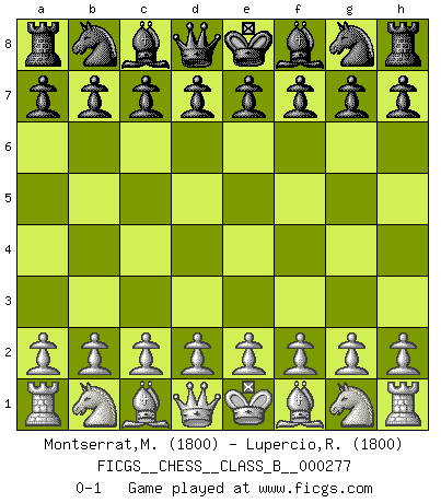Last move : 0-1 2018 July 13 19:31:43 [Event "FICGS__CHESS__CLASS_B__000277"] [Site "FICGS"] [Date "2018.06.03"] [Round "1"] [White "Montserrat,Maite"] [Black "Lupercio,Raziel"] [Result "0-1"] [WhiteElo "1800"] [BlackElo "1800"] 0-1 This chess game has been lost on time (started : 2018.06.03 19:11:55) Player Black won this chess game. Follow this game move after move (download)That's what Chess is all about. One day you give your opponent a lesson, the next day he gives you one. (Bobby Fischer) Schach ist Krieg, im Schach geht es um testosterongesteuerte Urschreie. (Garry Kasparov) Yo he agregado estos principios a la ley: pongan los Caballos en acción antes de que los dos Alfiles sean desarrollados. (Emanuel Lasker) RxDa4 pat (...) In theory there is no difference between theory and practice. In practice there is. (Yogi Berra)