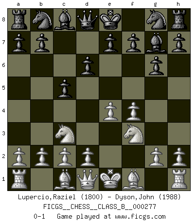 Last move : 0-1 2018 July 15 19:44:53 [Event "FICGS__CHESS__CLASS_B__000277"] [Site "FICGS"] [Date "2018.06.03"] [Round "1"] [White "Lupercio,Raziel"] [Black "Dyson,John"] [Result "0-1"] [WhiteElo "1800"] [BlackElo "1988"] 1.e4 c5 2.Nc3 d6 3.f4 g6 4.Nf3 Bg7 0-1 This chess game has been lost on time (started : 2018.06.03 19:11:55) Sicilian : Closed Player Black won this chess game. Follow this game move after move (download)If your opponent cannot do anything active, then don't rush the position; instead you should let him sit there, suffer, and beg you for a draw. (Jeremy Silman) In Buenos Aires ist es nicht mein vorrangiges Ziel ein starkes Turnier zu organisieren, sondern ein Turnier für Gentlemen. Ich würde nie Kamsky einladen. Ich mag keine Probleme. (Miguel Najdorf) El Ajedrez es 99 por ciento táctica. (Teichmann) Toutes les manuvres exécutées sur une colonne ouverte ont pour but ultime l'intrusion définitive sur la septième ou la huitième rangée, en plein cur de la position ennemie. (Aaron Nimzovitch) Those who make the worst use of their time are the first to complain of its brevity. (Jean de la Bruyere)