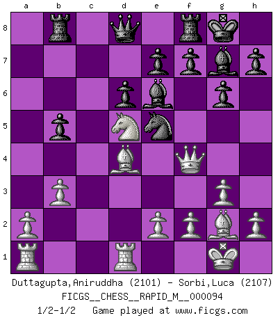 Last move : 1/2-1/2 2018 August 20 21:13:40 [Event "FICGS__CHESS__RAPID_M__000094"] [Site "FICGS"] [Date "2018.06.04"] [Round "1"] [White "Duttagupta,Aniruddha"] [Black "Sorbi,Luca"] [Result "1/2-1/2"] [WhiteElo "2101"] [BlackElo "2107"] 1.c4 c5 2.Nf3 Nf6 3.Nc3 Nc6 4.g3 g6 5.Bg2 Bg7 6.d4 cxd4 7.Nxd4 O-O 8.O-O Nxd4 9.Qxd4 d6 10.Qd3 a6 11.Be3 Ng4 12.Bd4 Ne5 13.Qe4 Rb8 14.Rfd1 Bf5 15.Qf4 b5 16.cxb5 axb5 17.Nd5 Be6 18.b3 1/2-1/2 English : Symmetrical variation Kingside Castling by player Black (move 7) Kingside Castling by player White (move 8) This chess game ended in a draw. Follow this game move after move (download)On the chessboard, lies and hypocrisy do not survive long. (Emanuel Lasker) Ohne Leiden bildet sich kein Charakter. (Ernst Freiherr von Feuchtersleben) Nunca antes ha habido un jugador de Ajedrez con tal conocimiento a fondo de las complejidades del juego y una inmensa voluntad absolutamente indomable de ganar. Yo pienso que Fischer es el jugador mas grande que jamás haya existido. (Lisa Lane) En blitz, le Cavalier l'emporte sur le Fou. (Vlastimil Hort) The best teachers teach from the heart, not from the book. (Author unknown)