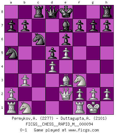 Last move : 0-1 2018 August 24 22:55:15 [Event "FICGS__CHESS__RAPID_M__000094"] [Site "FICGS"] [Date "2018.06.04"] [Round "1"] [White "Permykov,Andrey"] [Black "Duttagupta,Aniruddha"] [Result "0-1"] [WhiteElo "2277"] [BlackElo "2101"] 1.e4 c6 2.d4 d5 3.e5 Bf5 4.Nf3 e6 5.Be2 c5 6.c3 Nc6 7.O-O cxd4 8.cxd4 Nge7 9.Be3 Bg4 10.Nh4 Bxe2 11.Qxe2 Na5 12.Nd2 Rc8 13.b3 Nec6 14.Nhf3 Ba3 15.Nb1 Be7 0-1 This chess game has been lost on time (started : 2018.06.04 17:4:57) Caro-Kann : Advance variation Kingside Castling by player White (move 7) Player Black won this chess game. Follow this game move after move (download)He who takes the Queen's Knight's Pawn will sleep in the streets. (Anonymous) Über Karpov: Er war und ist ein Vertreter der russischen Reaktionäre. Das steckt tief in seiner Seele, wehalb ich nicht nett mit ihm umgehen kann. (Viktor Kortschnoi) El Ajedrez es tan interesante por sí solo, que no es necesario un interés monetario para persuadir a una persona a que lo practique; por lo tanto, nunca se juega por dinero. (Benjamin Franklin) Horreur, mais aussi harmonie suprême : qu'y avait-il en effet au monde en dehors des échecs ? Le brouillard, l'inconnu, le non-être... (Vladimir Nabokov) True nature is revealed in times of difficulty. (Chinese proverb)