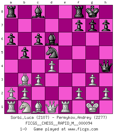 Last move : 1-0 2018 August 18 10:48:25 [Event "FICGS__CHESS__RAPID_M__000094"] [Site "FICGS"] [Date "2018.06.04"] [Round "1"] [White "Sorbi,Luca"] [Black "Permykov,Andrey"] [Result "1-0"] [WhiteElo "2107"] [BlackElo "2277"] 1.e4 e5 2.Nf3 Nc6 3.Bb5 a6 4.Ba4 Be7 5.O-O Nf6 6.Re1 b5 7.Bb3 O-O 8.c3 d5 9.exd5 Nxd5 10.Nxe5 Nxe5 11.Rxe5 c6 12.d4 Bd6 13.Re1 Qh4 14.g3 1-0 This chess game has been lost on time (started : 2018.06.04 17:4:57) Ruy Lopez Kingside Castling by player White (move 5) Kingside Castling by player Black (move 7) Player White won this chess game. Follow this game move after move (download)We must make sure that Chess will not be like a dead language, very interesting, but for a very small group. (Sytze Faber) Ja, jede Frau in Holland liebt mich bestimmt, und alle Männer hassen mich. (Loek van Wely) Bobby Fischer es el jugador de Ajedrez mas grande que jamás haya existido. (Ken Smith) Le thème de l'attaque double intervient d'une manière ou d'une autre dans l'immense majorité des combinaisons. (Youri Averbakh) There are 10 types of people in this world: those who understand binary and those who don't. (Anonymous)