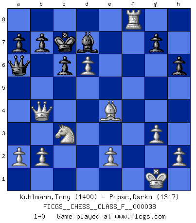 Last move : 1-0 2007 June 12 8:28:50 [Event "FICGS__CHESS__CLASS_F__000038"] [Site "FICGS"] [Date "2007.05.09"] [Round "1"] [White "Kuhlmann,Tony"] [Black "Pipac,Darko"] [Result "1-0"] [WhiteElo "1400"] [BlackElo "1317"] 1.d4 f5 2.Nf3 Nf6 3.g3 d6 4.Bg2 Nc6 5.d5 Ne5 6.Nxe5 dxe5 7.c4 e6 8.Bg5 exd5 9.cxd5 h6 10.Bxf6 Qxf6 11.O-O e4 12.Nc3 Bb4 13.Qa4+ Bd7 14.Qxb4 O-O-O 15.f3 Qa6 16.fxe4 fxe4 17.Bxe4 Rhf8 18.Rxf8 c6 19.Raf1 Rxf8 20.Rxf8+ Kc7 21.d6+ 1-0 Dutch Kingside Castling by player White (move 11) Queenside Castling by player Black (move 14) Player White won this chess game. Follow this game move after move (download)Every Pawn is a potential Queen. (James Mason) Schon mancher Spieler hat aufgegeben, um zu vermeiden, daß er eine Figur verliert. (Savielly Grigorievitsch Tartakower) El jugador táctico sabe que hacer cuando hay algo que hacer; mientras que el estratega sabe que hacer cuando no hay nada que hacer. (Gerald Abrahams) Vouloir jouer aux échecs contre soi-même est aussi paradoxal que vouloir marcher sur son ombre. (Stefan Zweig) Begin at the beginning and go on till you come to the end; then stop. (Lewis Carrol, Alice in Wonderland)