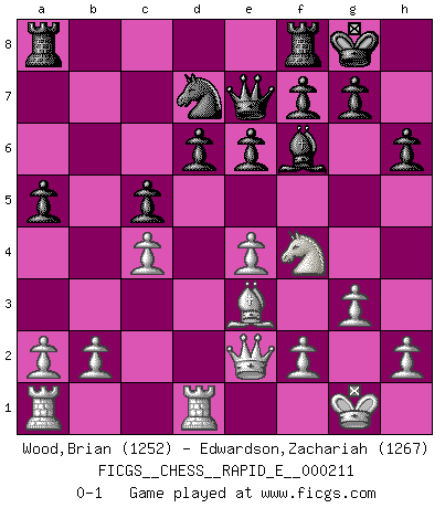 Last move : 0-1 2018 September 1 23:30:57 [Event "FICGS__CHESS__RAPID_E__000211"] [Site "FICGS"] [Date "2018.06.06"] [Round "1"] [White "Wood,Brian"] [Black "Edwardson,Zachariah"] [Result "0-1"] [WhiteElo "1252"] [BlackElo "1267"] 1.d4 Nf6 2.c4 e6 3.Nf3 b6 4.g3 Bb7 5.Bg2 Be7 6.O-O O-O 7.Nc3 Ne4 8.Nxe4 Bxe4 9.Bf4 d6 10.Qd2 Nd7 11.Rfd1 h6 12.Ne1 Bxg2 13.Nxg2 Qe8 14.e4 c5 15.Be3 Bf6 16.Qe2 Qe7 17.dxc5 bxc5 18.Nf4 a5 0-1 This chess game has been lost on time (started : 2018.06.06 11:56:58) Queen's Indian : Old Main line, 7.Nc3 Kingside Castling by player White (move 6) Kingside Castling by player Black (move 6) Player Black won this chess game. Follow this game move after move (download)Help your pieces so they can help you. (Paul Morphy) Wer nie einen Fehler gemacht hat, hat nie etwas Neues ausprobiert. (Albert Einstein) En partidas rápidas, el Caballo es mas poderoso que el Alfil. (Vlastimil Hort) Le plus grand jeu de l'esprit jamais inventé, plus vous l'apprenez, plus vous y prenez du plaisir. (Garry Kasparov) Rules and bones are meant to be broken. (Anonymous)