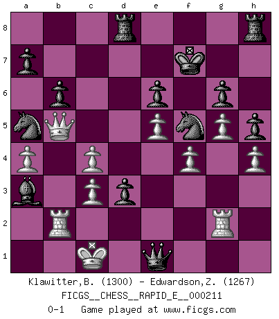 Last move : 0-1 2018 August 4 5:18:57 [Event "FICGS__CHESS__RAPID_E__000211"] [Site "FICGS"] [Date "2018.06.06"] [Round "1"] [White "Klawitter,Bernd"] [Black "Edwardson,Zachariah"] [Result "0-1"] [WhiteElo "1300"] [BlackElo "1267"] 1.e4 c6 2.d4 d5 3.e5 Bf5 4.Nc3 e6 5.g4 Bg6 6.h4 h5 7.g5 c5 8.f4 Nc6 9.Bd3 cxd4 10.Bxg6 dxc3 11.Bxf7+ Kxf7 12.bxc3 Nge7 13.Nf3 Nf5 14.Rg1 g6 15.Rb1 Qc7 16.Bd2 Bc5 17.Rg2 Rad8 18.Qe2 d4 19.Qb5 b6 20.c4 d3 21.c3 Na5 22.Kd1 Qb7 23.a4 Qxf3+ 24.Kc1 Ba3+ 25.Rb2 Qf1+ 26.Be1 Qxe1+ 0-1 Caro-Kann : Advance variation Player Black won this chess game. Follow this game move after move (download)Chess is a matter of delicate judgment, knowing when to punch and how to duck. (Bobby Fischer) Obwohl ich alt bin, darf mir niemand den Finger in den Mund stecken, sonst beisse ich. (Wilhelm Steinitz) Bendita sea la memoria de aquel que dio al mundo este juego inmortal. (A. G. Gardiner) Tous ces prétendus hommes politiques sont les pions, les Cavaliers, les Tours ou les Fous d'une partie d'échecs qui se jouera tant qu'un hasard ne renversera pas l'échiquier. (Honoré de Balzac) There are more things in heaven and earth than practically anywhere else. (Unknown)
