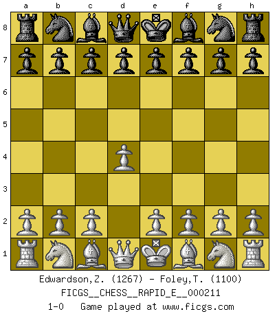 Last move : 1-0 2018 July 7 6:35:6 [Event "FICGS__CHESS__RAPID_E__000211"] [Site "FICGS"] [Date "2018.06.06"] [Round "1"] [White "Edwardson,Zachariah"] [Black "Foley,Thomas"] [Result "1-0"] [WhiteElo "1267"] [BlackElo "1100"] 1.d4 1-0 This chess game has been lost on time (started : 2018.06.06 11:56:58) Queen's pawn Player White won this chess game. Follow this game move after move (download)I look one move ahead... the best ! (Siegbert Tarrasch) Wenn es im Universum noch irgendwo intelligente Lebewesen gibt, dann kennen sie Go. (Emanuel Lasker) Un entendimiento minucioso de las típicas continuaciones de mate hacen de las mas complicadas combinaciones de sacrificio que conducen hacia ellas no solo no dificiles, sino casi un asunto de rutina. (Siegbert Tarrasch) On est toujours la mazette de quelqu'un d'autre. (Anonyme) Wipe them out. All of them. (Darth Sidious in Star Wars ep.1)