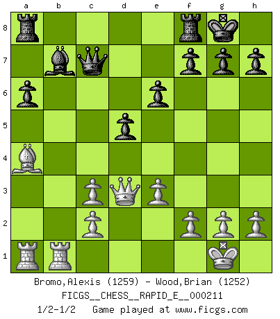Last move : 1/2-1/2 2018 July 25 21:46:6 [Event "FICGS__CHESS__RAPID_E__000211"] [Site "FICGS"] [Date "2018.06.06"] [Round "1"] [White "Bromo,Alexis"] [Black "Wood,Brian"] [Result "1/2-1/2"] [WhiteElo "1259"] [BlackElo "1252"] 1.d4 e6 2.a3 d5 3.Nc3 Nf6 4.Bg5 Be7 5.Bxf6 Bxf6 6.e3 O-O 7.Nf3 c6 8.Bd3 c5 9.dxc5 Nc6 10.Bb5 Ne5 11.Nxe5 Bxe5 12.O-O a6 13.Ba4 Bxc3 14.bxc3 Qa5 15.Bb3 Qxc5 16.Qd3 b5 17.a4 bxa4 18.Bxa4 Bb7 19.Rfb1 Qc7 1/2-1/2 Queen's pawn Kingside Castling by player Black (move 6) Kingside Castling by player White (move 12) This chess game ended in a draw. Follow this game move after move (download)Chess is no whit inferior to the violin, and we have a large number of professional violinists. (Mikhail Botvinnik) Wenn ich gewinne bin ich ein Genie. Wenn nicht, dann bin ich keines. (Robert James Fischer) Todo lo que importa ante el tablero de Ajedrez son buenas jugadas. (Bobby Fischer) Celui qui prend des risques peut perdre, celui qui n'en prend pas perd toujours. (Xavier Tartacover) Unless in communicating with it one says exactly what one means, trouble is bound to result. (Alan Turing, about computers)