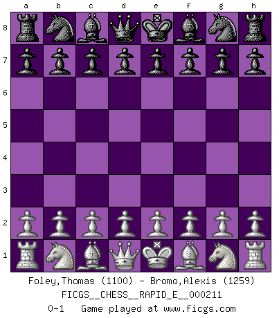 Last move : 0-1 2018 July 6 18:9:44 [Event "FICGS__CHESS__RAPID_E__000211"] [Site "FICGS"] [Date "2018.06.06"] [Round "1"] [White "Foley,Thomas"] [Black "Bromo,Alexis"] [Result "0-1"] [WhiteElo "1100"] [BlackElo "1259"] 0-1 This chess game has been lost on time (started : 2018.06.06 11:56:58) Player Black won this chess game. Follow this game move after move (download)When I have White, I win because I am white; When I have Black, I win because I am Bogolyubov. (Bogolyubov) Die Auseinandersetzung mit Karpow war politisch geprägt. Er stand für das kommunistische System, wurde von dessen Repräsentanten gehätschelt. Ich war der Oppositionelle. Jeder Schachweltmeister spiegelt auch die gesellschaftlichen Verhältnisse wider. Kramnik steht für die Börsen-Generation des Neuen Markts, ideologiefrei, zahlenfixiert. (Garry Kasparov) Los Peones son el alma de una partida de Ajedrez. (Francois Andre Danican Philidor) Un journaliste : 'Vous préférez avoir une dame de plus sur l'échiquier ou au lit ?' Boris Spassky : 'Ca dépend de la position.' The production of too many useful things results in too many useless people. (Karl Marx)