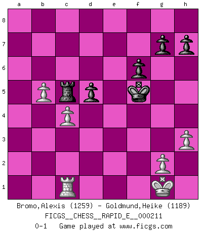 Last move : 0-1 2018 October 2 22:16:35 [Event "FICGS__CHESS__RAPID_E__000211"] [Site "FICGS"] [Date "2018.06.06"] [Round "1"] [White "Bromo,Alexis"] [Black "Goldmund,Heike"] [Result "0-1"] [WhiteElo "1259"] [BlackElo "1189"] 1.d4 Nf6 2.c4 b6 3.Nc3 Bb7 4.Nf3 e6 5.Bg5 c5 6.dxc5 bxc5 7.e3 Be7 8.h3 Ne4 9.Nxe4 Bxe4 10.Bxe7 Qxe7 11.Bd3 Bxd3 12.Qxd3 O-O 13.Rd1 Rd8 14.O-O Nc6 15.a3 d6 16.Rfe1 Rab8 17.b3 a5 18.e4 f6 19.Qc3 Qb7 20.Rb1 Qc7 21.Red1 a4 22.b4 cxb4 23.axb4 Qa7 24.b5 Qa5 25.Qxa5 Nxa5 26.Nd2 Rdc8 27.Rdc1 Rb6 28.Ra1 Kf7 29.Rxa4 Nb7 30.Nb3 Nc5 31.Nxc5 Rxc5 32.Ra7+ Kg6 33.f4 d5 34.f5+ exf5 35.exf5+ Kxf5 36.Ra6 Rb7 37.Rc6 Rc7 38.Rxc5 Rxc5 0-1 Queen's Indian Accelerated Kingside Castling by player Black (move 12) Kingside Castling by player White (move 14) Player Black won this chess game. Follow this game move after move (download)The Chess pieces are the block alphabet which shapes thoughts; and these thoughts, although making a visual design on the chessboard, express their beauty abstractly, like a poem. (Marcel Duchamp) Privat ist Kortschnoi kein schlechter Mensch, sehr sympathisch. Aber während des Spiels ist er grausam. Er will dich töten. (Miguel Najdorf) Las piezas de Ajedrez son los bloques del alfabeto que moldean los pensamientos; y esos pensamientos, aunque hagan un diseño visual en el tablero, expresan abstractamente su belleza como un poema. (Marcel Duchamp) Les échecs, c'est la lutte contre l'erreur. (Johannes Zukertort) I don't believe in psychology. I believe in good moves. (Bobby Fischer)