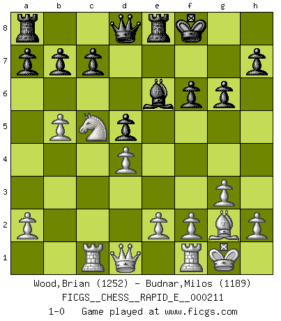 Last move : 1-0 2018 September 18 13:59:59 [Event "FICGS__CHESS__RAPID_E__000211"] [Site "FICGS"] [Date "2018.06.06"] [Round "1"] [White "Wood,Brian"] [Black "Budnar,Milos"] [Result "1-0"] [WhiteElo "1252"] [BlackElo "1189"] 1.d4 Nf6 2.c4 g6 3.Nf3 d5 4.g3 e6 5.Bg2 Bg7 6.O-O O-O 7.Nc3 Nc6 8.Ne5 Na5 9.b3 dxc4 10.Ba3 Re8 11.b4 Nc6 12.Nxc6 Qd7 13.Ne5 Qd6 14.Nxc4 Qd8 15.Ne5 Nd5 16.Nxd5 exd5 17.b5 Be6 18.Rc1 f6 19.Nd3 Bf8 20.Bxf8 Kxf8 21.Nc5 1-0 King's Indian, 3.Nf3 Kingside Castling by player White (move 6) Kingside Castling by player Black (move 6) Player White won this chess game. Follow this game move after move (download)When you don't know what to play, wait for an idea to come into your opponent's mind. You may be sure that idea will be wrong. (Siegbert Tarrasch) Spielt Blackmar-Diemer-Gambit, und das Matt kommt von selbst! (Emil Joseph Diemer) Observen a Garry Kasparov. Después de una derrota, invariablemente el gana la próxima partida. Prácticamente hace pedazos a su siguiente oponente. Eso es algo que tenemos que aprender a lograr. (Maurice Ashley) Pour moi, les échecs ne sont pas un jeu mais un art. (Alexandre Alekhine) Difficult things take a long time, impossible things a little longer. (Author unknown)