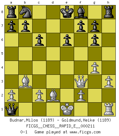 Last move : 0-1 2018 August 27 16:21:4 [Event "FICGS__CHESS__RAPID_E__000211"] [Site "FICGS"] [Date "2018.06.06"] [Round "1"] [White "Budnar,Milos"] [Black "Goldmund,Heike"] [Result "0-1"] [WhiteElo "1189"] [BlackElo "1189"] 1.e4 d5 2.exd5 Qxd5 3.Nc3 Qa5 4.d4 Nf6 5.Nf3 Bg4 6.h3 Bh5 7.g4 Bg6 8.Ne5 e6 9.Bb5+ c6 10.Ba4 Ne4 11.Bb3 Nxc3 12.bxc3 Qxc3+ 13.Bd2 Qxd4 14.Nxg6 hxg6 15.Qf3 Qxa1+ 0-1 Scandinavian defense, Lasker variation Player Black won this chess game. Follow this game move after move (download)I thought the most common mistake [in chess] was the first one: Learning the game :P (Garvin Gray, FICGS forum) Wie, soll nun auch die Opposition abgeschafft werden? Ja, es tut mir leid, Ihnen diesen Schmerz nicht ersparen zu können. (Aaron Nimzowitsch) Cuando tu casa esta en llamas, no puedes ser molestado por tus vecinos. O, como decinos en Ajedrez, si tu Rey esta bajo ataque, no te preocupa perder un Peón del lado de la Reina. (Gary Kasparov) La menace est plus forte que l'exécution. (Aaron Nimzovitch) The real danger is not that computers will begin to think like men, but that men will begin to think like computers. (Sydney J. Harris)