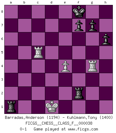 Last move : 0-1 2007 May 24 23:11:30 [Event "FICGS__CHESS__CLASS_F__000038"] [Site "FICGS"] [Date "2007.05.09"] [Round "1"] [White "Barradas,Anderson"] [Black "Kuhlmann,Tony"] [Result "0-1"] [WhiteElo "1194"] [BlackElo "1400"] 1.e4 d6 2.d4 Nf6 3.Nc3 e5 4.dxe5 dxe5 5.Qxd8+ Kxd8 6.Bg5 Be6 7.O-O-O Nbd7 8.Nf3 Bd6 9.Nb5 Ke7 10.Nxd6 cxd6 11.b3 h6 12.Bxf6+ Nxf6 13.Bd3 Bg4 14.h3 Bxf3 15.gxf3 Rhd8 16.Rhg1 Kf8 17.Bc4 Nh5 18.Bd5 Rab8 19.Rg4 Nf4 20.Bc4 Nxh3 21.Rd2 Nf4 22.a4 a6 23.Rd1 b5 24.axb5 axb5 25.Bf1 Rb6 26.c4 bxc4 27.Bxc4 Rc8 28.Kc2 Ne2 29.f4 Nxf4 30.f3 Ne2 31.Rd2 Nd4+ 32.Kd1 Nxb3 33.Bxb3 Rxb3 34.Rxd6 Rxf3 35.Rd5 Rf2 36.Rxe5 Ra8 37.Rc5 Ra1+ 0-1 Pirc defense Queenside Castling by player White (move 7) 10 pieces endgame at move 36 : White KRRP , Black KRRPPP WHITE : King + 2 Rooks 1 Pawn BLACK : King + 2 Rooks 3 Pawns Player Black won this chess game. Follow this game move after move (download)The way he plays Chess demonstrates a man's whole nature. (Stanley Ellin) Wenn du gegen Bobby spielst, ist es keine Frage von gewinnen oder verlieren. Es ist eine Frage des Überlebens. (Boris Vassilievich Spassky) En posiciones complicadas, Bobby Fischer pocas veces tuvo que temer de cualquiera. (Paul Keres) Vous savez, camarade Pachman, je n'éprouve pas de plaisir à être ministre, je jouerais plutôt aux échecs comme vous, ou alors ferais une révolution au Venezuela. (Che Guevara à Ludek Pachman, 'Checkmate in Prague', 1975) The Internet is so big, so powerful and pointless that for some people it is a complete substitute for life. (Andrew Brown)