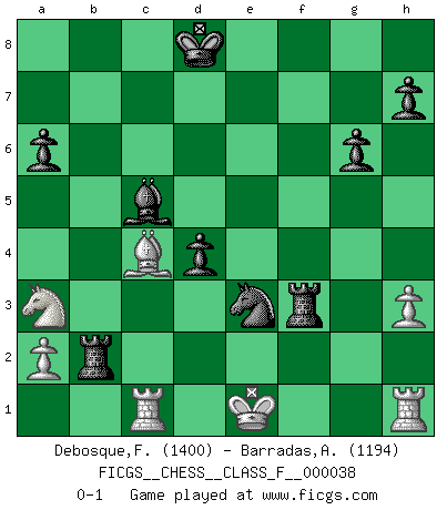 Last move : 0-1 2007 June 16 23:20:51 [Event "FICGS__CHESS__CLASS_F__000038"] [Site "FICGS"] [Date "2007.05.09"] [Round "1"] [White "Debosque,Franck"] [Black "Barradas,Anderson"] [Result "0-1"] [WhiteElo "1400"] [BlackElo "1194"] 1.e4 e5 2.f4 exf4 3.d4 d5 4.exd5 Qxd5 5.Bxf4 c5 6.Nf3 Bg4 7.h3 Bxf3 8.Qxf3 Qxf3 9.gxf3 cxd4 10.Bxb8 Rxb8 11.Bb5+ Kd8 12.Na3 Bb4+ 13.Kf1 Nf6 14.Rd1 a6 15.Bc4 Bc5 16.Bxf7 Rf8 17.Bc4 b5 18.Bd3 g6 19.c3 Nd5 20.c4 Ne3+ 21.Ke1 Rxf3 22.Rc1 bxc4 23.Bxc4 Rxb2 0-1 KGA : Villemson (Steinitz) gambit Player Black won this chess game. Follow this game move after move (download)He who takes the Queen's Knight's Pawn will sleep in the streets. (Anonymous) Besser ein falscher Plan, logisch durchgeführt, als gar kein Plan. (Viktor Kortschnoi) La partida mas dura de ganar es una partida ganada. (Emanuel Lasker) Mais l'homme est une créature légère et illogique : semblable au joueur d'échecs, il n'aime que le processus du but à atteindre, non le but lui-même. (Dostoïevsky) There are more things in heaven and earth than practically anywhere else. (Unknown)