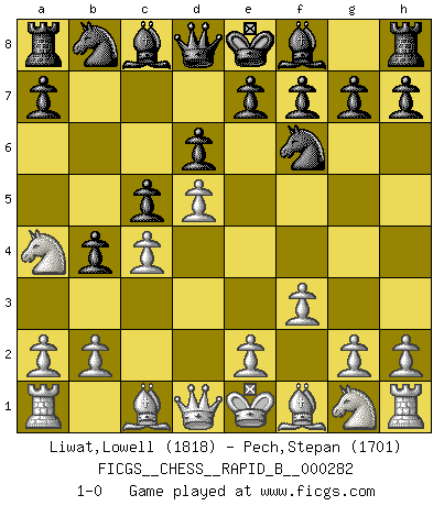 Last move : 1-0 2018 August 1 6:10:51 [Event "FICGS__CHESS__RAPID_B__000282"] [Site "FICGS"] [Date "2018.06.09"] [Round "1"] [White "Liwat,Lowell"] [Black "Pech,Stepan"] [Result "1-0"] [WhiteElo "1818"] [BlackElo "1701"] 1.d4 Nf6 2.c4 c5 3.d5 b5 4.Nc3 b4 5.Na4 d6 6.f3 1-0 Benko gambit Player White won this chess game. Follow this game move after move (download)Not only will I predict his triumph over Botvinnik, but I'll go further and say that he'll probably be the greatest Chess player that ever lived. (John Collins) Es genügt nicht ein guter Spieler zu sein, man muß auch gut spielen. (Siegbert Tarrasch) Si yo gano un torneo, yo lo gano por mí mismo. Yo hago las jugadas. Nadie me ayuda. (Bobby Fischer) Même si vous avez un bon coup à faire, regardez toujours s'il n'y en a pas un qui lui soit préférable. (Pedro Damiano) A good teacher is like a candle - it consumes itself to light the way for others. (Author unknown)