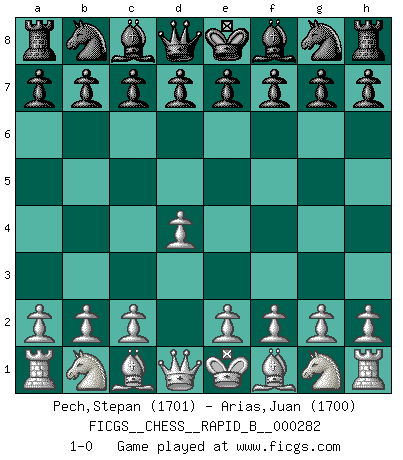 Last move : 1-0 2018 July 9 19:8:0 [Event "FICGS__CHESS__RAPID_B__000282"] [Site "FICGS"] [Date "2018.06.09"] [Round "1"] [White "Pech,Stepan"] [Black "Arias,Juan"] [Result "1-0"] [WhiteElo "1701"] [BlackElo "1700"] 1.d4 1-0 This chess game has been lost on time (started : 2018.06.09 14:58:8) Queen's pawn Player White won this chess game. Follow this game move after move (download)Play the opening like a book, the middle game like a magician, and the endgame like a machine. (Spielmann) Alle Schachspieler sollten auch ein Hobby haben. (Savielly Grigorievitsch Tartakower) Solo el jugador con la iniciativa tiene el derecho a atacar. (Wilhelm Steinitz) RxDa4 pat (...) You know what they say : You lie down with the Devil, you wake up in Hell. (Horatio Caine, C.S.I. Miami)
