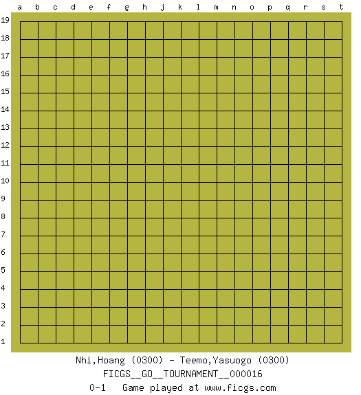 Last move : 0-1 2018 July 10 7:10:30 [Event "FICGS__GO__TOURNAMENT__000016"] [Site "FICGS"] [Date "2018.06.09"] [Round "1"] [Black "Nhi,Hoang"] [White "Teemo,Yasuogo"] [Result "0-1"] [Rating 1 "0300"] [Rating 2 "0300"] 0-1 This go game has been lost on time (started : 2018.06.09 22:10:22) Here are the names of the openings (joseki) played in the four corners : Player White won this Go (weiqi, baduk) game. Follow this game move after move (download)Very few good moves are played. (Pierre Audouard) Always remember that you are unique; just like everyone else. (Unknown)