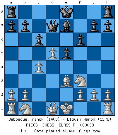 Last move : 1-0 2007 August 15 3:34:44 [Event "FICGS__CHESS__CLASS_F__000038"] [Site "FICGS"] [Date "2007.05.09"] [Round "1"] [White "Debosque,Franck"] [Black "Blouin,Aaron"] [Result "1-0"] [WhiteElo "1400"] [BlackElo "1276"] 1.e4 d6 2.d4 e5 3.Nf3 Nc6 4.Bb5 Nf6 5.d5 Bd7 6.dxc6 Bxc6 7.Bxc6+ Nd7 8.Bg5 Be7 9.Bxd7+ Qxd7 10.c3 f6 11.Be3 d5 12.exd5 c6 13.c4 1-0 This chess game has been lost on time (started : 2007.05.09 15:26:23) King's pawn Opening Player White won this chess game. Follow this game move after move (download)A strong memory, concentration, imagination, and a strong will is required to become a great Chess player. (Bobby Fischer) Vielleicht wirkt die Aura früherer Spieler glanzvoller als die der heutigen Spieler, aber das liegt daran, dass man kein Programm wie Fritz hatte, das einem all die Löcher in ihren Partien zeigt. (Vladimir Kramnik) Bobby es el jugador de Ajedrez mas fino que este país jamás haya producido. Su memoria para las movidas, su brillantez en soñar combinaciones y su feróz determinación por la victoria son algo extraño. (John Collins) Les erreurs sont comme les malheurs, elles n'arrivent jamais seules. (Siegbert Tarrasch) When you don't know what to do, walk fast and look worried. (Anonymous)