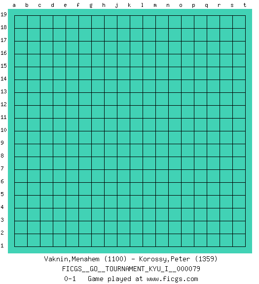 Last move : 0-1 2018 July 10 7:10:30 [Event "FICGS__GO__TOURNAMENT_KYU_I__000079"] [Site "FICGS"] [Date "2018.06.10"] [Round "1"] [Black "Vaknin,Menahem"] [White "Korossy,Peter"] [Result "0-1"] [Rating 1 "1100"] [Rating 2 "1359"] 0-1 This go game has been lost on time (started : 2018.06.10 5:10:6) Here are the names of the openings (joseki) played in the four corners : Player White won this Go (weiqi, baduk) game. Follow this game move after move (download)Go is to western chess what philosophy is to double entry accounting. (from Shibumi, by Trevanian) There will be no order, only chaos. (Sol Robeson in Pi by Darren Aronofsky)