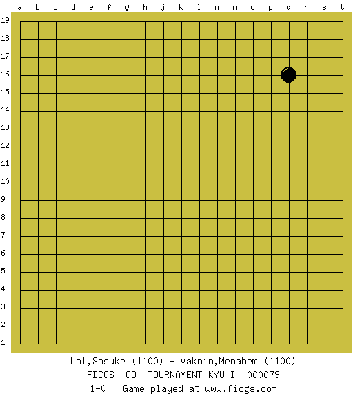Last move : 1-0 2018 July 10 19:14:46 [Event "FICGS__GO__TOURNAMENT_KYU_I__000079"] [Site "FICGS"] [Date "2018.06.10"] [Round "1"] [Black "Lot,Sosuke"] [White "Vaknin,Menahem"] [Result "1-0"] [Rating 1 "1100"] [Rating 2 "1100"] 1.q16 1-0 This go game has been lost on time (started : 2018.06.10 5:10:6) Here are the names of the openings (joseki) played in the four corners : Player Black won this Go (weiqi, baduk) game. Follow this game move after move (download)Learn to play under the stones. (Anonymous) Man is reluctant to give credit for intelligence to anyone, except his enemies. (Albert Einstein)