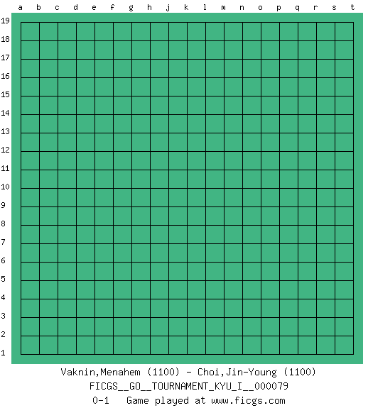 Last move : 0-1 2018 July 10 7:10:30 [Event "FICGS__GO__TOURNAMENT_KYU_I__000079"] [Site "FICGS"] [Date "2018.06.10"] [Round "1"] [Black "Vaknin,Menahem"] [White "Choi,Jin-Young"] [Result "0-1"] [Rating 1 "1100"] [Rating 2 "1100"] 0-1 This go game has been lost on time (started : 2018.06.10 5:10:6) Here are the names of the openings (joseki) played in the four corners : Player White won this Go (weiqi, baduk) game. Follow this game move after move (download)It is difficult to know exactly what you are doing. (Pierre Audouard) Even the best needles are not sharp at both ends. (Chinese proverb)