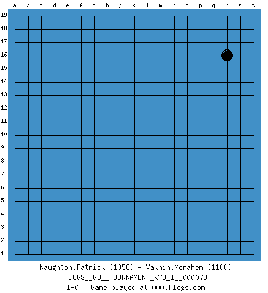 Last move : 1-0 2018 July 10 19:14:46 [Event "FICGS__GO__TOURNAMENT_KYU_I__000079"] [Site "FICGS"] [Date "2018.06.10"] [Round "1"] [Black "Naughton,Patrick"] [White "Vaknin,Menahem"] [Result "1-0"] [Rating 1 "1058"] [Rating 2 "1100"] 1.r16 1-0 This go game has been lost on time (started : 2018.06.10 5:10:6) Here are the names of the openings (joseki) played in the four corners : Player Black won this Go (weiqi, baduk) game. Follow this game move after move (download)The monkey jump is worth eight points. (Anonymous) The ultimate in disposing one's troops is to be without ascertainable shape. Then the most penetrating spies cannot pry in nor can the wise lay plans against you. (Sun Tzu)