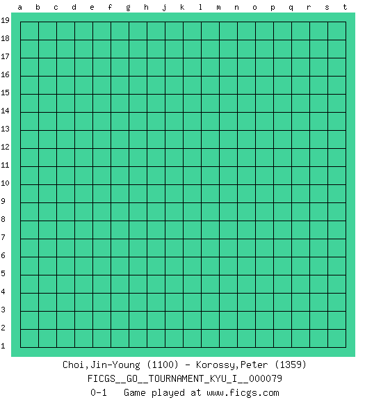 Last move : 0-1 2018 July 10 7:10:30 [Event "FICGS__GO__TOURNAMENT_KYU_I__000079"] [Site "FICGS"] [Date "2018.06.10"] [Round "1"] [Black "Choi,Jin-Young"] [White "Korossy,Peter"] [Result "0-1"] [Rating 1 "1100"] [Rating 2 "1359"] 0-1 This go game has been lost on time (started : 2018.06.10 5:10:6) Here are the names of the openings (joseki) played in the four corners : Player White won this Go (weiqi, baduk) game. Follow this game move after move (download)Don't make empty triangles. (Anonymous) God is an atheist. (Unknown)