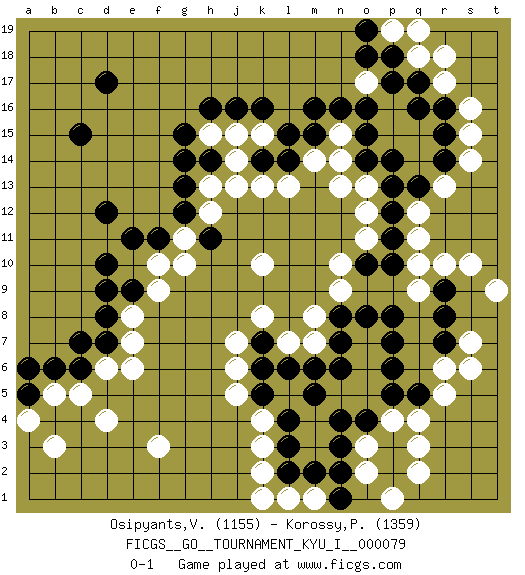 Last move : 0-1 2018 August 15 10:7:19 [Event "FICGS__GO__TOURNAMENT_KYU_I__000079"] [Site "FICGS"] [Date "2018.06.10"] [Round "1"] [Black "Osipyants,Vladimir"] [White "Korossy,Peter"] [Result "0-1"] [Rating 1 "1155"] [Rating 2 "1359"] 1.q16 d4 2.d17 q4 3.c15 o17 4.m16 r17 5.q17 q18 6.p18 r18 7.p17 s15 8.o16 k4 9.d10 q10 10.n4 r6 11.n6 f3 12.c6 k10 13.p3 q3 14.p2 q2 15.l3 k3 16.l4 d6 17.c7 c5 18.h16 r13 19.d12 k15 20.k16 j15 21.j16 m14 22.p14 o13 23.p13 o12 24.g14 h13 25.g13 h12 26.g12 e8 27.d9 f9 28.k7 j6 29.k6 j7 30.k5 j5 31.p8 o7 32.p7 o6 33.p6 o5 34.p5 p4 35.o4 n5 36.o8 m8 37.n7 o3 38.n3 o2 39.n2 p1 40.r8 s10 41.r7 s6 42.o10 n10 43.p10 n9 44.m5 g11 45.f11 f10 46.e11 k8 47.h14 j14 48.h11 g10 49.l15 k13 50.l14 l13 51.m15 n14 52.o15 q12 53.p12 o11 54.p11 t9 55.r16 s16 56.r15 b5 57.b6 k2 58.a5 a4 59.a6 b3 60.d7 e7 61.d8 n15 62.n16 p19 63.o19 q19 64.o18 l7 65.l6 m7 66.m6 m1 67.l2 l1 68.n1 h15 69.g15 q11 70.r14 s14 71.q13 q9 72.r9 r10 73.m2 k1 74.k14 j13 75.o14 n13 76.q5 r5 77.n8 s7 78.e9 e6 0-1 Here are the names of the openings (joseki) played in the four corners : Corner q16 : q16 o17 Hoshi (Hwajeom, Seongjeom, Xingwei`) 4-4 Point. The star or hoshi (4-4) point, emphasizing influence at the potential expense of territory. Ikken Kakari (Hankan Keolch'im, Yi Gua`jiao~, 1-Space Low Approach). White 2 is the standard approach move to the 4-4. Corner q4 : q4 n4 Hoshi (Hwajeom, Seongjeom, Xingwei`) 4-4 Point. The star or hoshi (4-4) point, emphasizing influence at the potential expense of territory. Niken Takagakari (Dukan Nop'dakeolch'im, E`r Gaojia, 2-Space High Approach). Black 2 is a light approach move. Rarely played in even games, Black 2 is typically employed in handicap games. White continues with 6-4 or 3-10. In Korean Sunjang Baduk White has a stone on 8-4. Player White won this Go (weiqi, baduk) game. Follow this game move after move (download)More haste less speed. (John Fairbairn) I'm extremely disappointed. I send you out for exciting, new designer drugs, you come back with tomato sauce. (Gregory House, House M.D.)