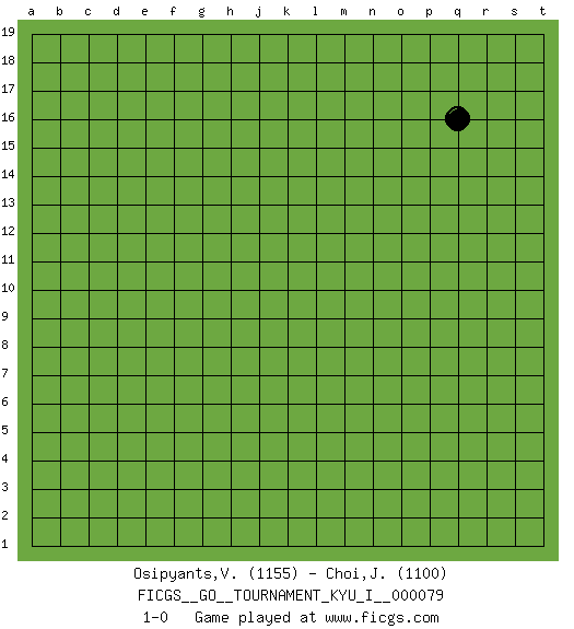 Last move : 1-0 2018 July 10 19:14:46 [Event "FICGS__GO__TOURNAMENT_KYU_I__000079"] [Site "FICGS"] [Date "2018.06.10"] [Round "1"] [Black "Osipyants,Vladimir"] [White "Choi,Jin-Young"] [Result "1-0"] [Rating 1 "1155"] [Rating 2 "1100"] 1.q16 1-0 This go game has been lost on time (started : 2018.06.10 5:10:6) Here are the names of the openings (joseki) played in the four corners : Player Black won this Go (weiqi, baduk) game. Follow this game move after move (download)Good moves and bad moves are bedfellows. (Anonymous) To steal ideas from one person is plagiarism. To steal from many is research. (Unknown)