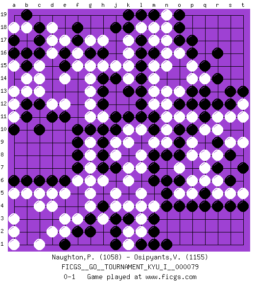 Last move : 0-1 2018 June 25 9:24:8 [Event "FICGS__GO__TOURNAMENT_KYU_I__000079"] [Site "FICGS"] [Date "2018.06.10"] [Round "1"] [Black "Naughton,Patrick"] [White "Osipyants,Vladimir"] [Result "0-1"] [Rating 1 "1058"] [Rating 2 "1155"] 1.r16 d4 2.q4 d16 3.o17 q10 4.k3 r6 5.r4 f3 6.c10 c14 7.c6 g17 8.r12 r11 9.q12 k16 10.e6 n16 11.l17 n17 12.l16 o16 13.p17 n13 14.l15 k15 15.l14 k14 16.l13 p14 17.r14 n11 18.k13 o7 19.n4 k17 20.l11 m9 21.j11 g14 22.f10 k6 23.k8 h6 24.h8 g7 25.f7 g8 26.f8 g9 27.g10 g5 28.c3 c4 29.d3 e3 30.b4 b5 31.a4 a5 32.b2 c5 33.b6 a3 34.b3 d2 35.c2 e2 36.g3 c1 37.g2 g4 38.h4 e12 39.d11 d12 40.c12 c13 41.b12 b13 42.e11 g12 43.h13 g13 44.h14 h15 45.h12 p5 46.p4 o5 47.o4 s11 48.s12 t12 49.s13 l8 50.m6 l5 51.n5 l3 52.m3 l2 53.m2 m4 54.l1 k2 55.k5 k4 56.j3 j5 57.j2 k1 58.f2 j4 59.j1 m1 60.n1 h3 61.l1 l4 62.q11 r10 63.p10 p9 64.o10 n10 65.o9 p8 66.o8 n7 67.p7 q7 68.o12 n12 69.h9 l7 70.m7 k9 71.p16 n18 72.o18 l18 73.s8 r8 74.s6 s7 75.t7 s5 76.r7 r5 77.r9 q8 78.q5 q6 79.n8 s9 80.s4 t5 81.t4 p15 82.q15 q14 83.q13 o11 84.c17 d17 85.c16 c15 86.b15 b14 87.b16 b18 88.c18 d18 89.b19 a18 90.a17 a15 91.a16 a12 92.b11 a11 93.a10 a13 94.j7 j9 95.h10 j8 96.h7 k7 97.p13 p11 98.m8 o13 99.p12 m15 100.k18 m17 101.l19 m18 102.j18 h17 103.m10 n9 104.m19 n19 105.k19 m14 106.m16 m13 107.t13 t11 108.o19 n15 109.h16 j15 110.j14 g11 111.f9 g6 112.g16 g15 113.a6 e5 114.m1 h11 115.j10 k10 116.k11 l10 117.m11 m12 118.l12 f6 119.d6 d5 120.b1 a2 121.e1 a1 122.o6 p6 123.n6 t9 124.p7 o7 125.f17 f16 126.e16 f15 127.e15 e17 128.f18 e14 0-1 Here are the names of the openings (joseki) played in the four corners : Corner q4 : q4 r6 Hoshi (Hwajeom, Seongjeom, Xingwei`) 4-4 Point. The star or hoshi (4-4) point, emphasizing influence at the potential expense of territory. Ikken Kakari (Hankan Keolch'im, Yi Gua`jiao~, 1-Space Low Approach). White 2 is the standard approach move to the 4-4. Player White won this Go (weiqi, baduk) game. Follow this game move after move (download)While the Baroque rules of chess could only have been created by humans, the rules of go are so elegant, organic, and rigorously logical that if intelligent life forms exist elsewhere in the universe, they almost certainly play go. (Edward Lasker, international chess master) A woman without a man is like a fish without a bicycle. (Gloria Steinem)