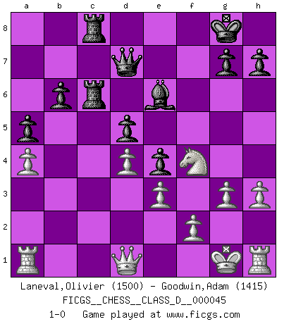 Last move : 1-0 2007 September 14 20:23:1 [Event "FICGS__CHESS__CLASS_D__000045"] [Site "FICGS"] [Date "2007.05.10"] [Round "1"] [White "Laneval,Olivier"] [Black "Goodwin,Adam"] [Result "1-0"] [WhiteElo "1500"] [BlackElo "1415"] 1.d4 Nf6 2.c4 e6 3.Nf3 Bb4+ 4.Bd2 Qe7 5.g3 Nc6 6.Bg2 Bxd2+ 7.Qxd2 Ne4 8.Qc2 Qb4+ 9.Kf1 d5 10.cxd5 exd5 11.a3 Qd6 12.e3 O-O 13.Nc3 f5 14.Kg1 Be6 15.b4 a5 16.b5 Na7 17.a4 Rac8 18.Ne2 b6 19.Ne5 c6 20.bxc6 Nxc6 21.Nxc6 Rxc6 22.Qd1 Rfc8 23.Bxe4 fxe4 24.Nf4 Qd7 25.h3 1-0 Bogo-Indian defense, Nimzovich variation Kingside Castling by player Black (move 12) Player White won this chess game. Follow this game move after move (download)Bobby Fischer's current state of mind is indeed a tragedy. One of the world's greatest Chess players - the pride and sorrow of American Chess. (Frank Brady) Im Hotelzimmer gab es nur zwei Schaben. (Über die Turnierbedingungen) (Peter Swidler) Cuando la partida de Ajedrez termina, el Peón y el Rey regresan a la misma caja. (Irish saying) Les ravages du H expliquent la différence de niveau entre Tal et Thal [Abergel]. Art is not a thing, it is a way. (Elbert Hubbard)