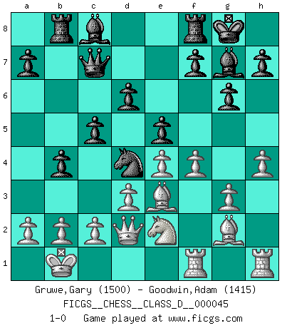 Last move : 1-0 2007 August 19 16:23:21 [Event "FICGS__CHESS__CLASS_D__000045"] [Site "FICGS"] [Date "2007.05.10"] [Round "1"] [White "Gruwe,Gary"] [Black "Goodwin,Adam"] [Result "1-0"] [WhiteElo "1500"] [BlackElo "1415"] 1.e4 c5 2.Nc3 g6 3.g3 Bg7 4.Bg2 Nc6 5.d3 d6 6.h3 Nf6 7.Nge2 O-O 8.Be3 Ne8 9.Qd2 Nd4 10.O-O-O e5 11.f4 b5 12.Rdf1 b4 13.Nd5 Nc7 14.Nxc7 Qxc7 15.Kb1 Rb8 16.h4 1-0 This chess game has been lost on time (started : 2007.05.10 18:12:46) Sicilian : Closed Kingside Castling by player Black (move 7) Queenside Castling by player White (move 10) Player White won this chess game. Follow this game move after move (download)If Chess is a science, it's a most inexact one. If Chess is an art, it is too exacting to be seen as one. If Chess is a sport, it's too esoteric. If Chess is a game, it's too demanding to be just a game. If Chess is a mistress, she's a demanding one. If Chess is a passion, it's a rewarding one. If Chess is life, it's a sad one. (Unknown) Wer wird heute Abend ihr Gegner sein? -- Heute Abend spiele ich gegen die schwarzen Steine. (Akiba Rubinstein) Sin errores no puede haber brillantez. (Emanuel Lasker) Les réformistes prétendent que les progrès de la théorie conduiront à la disparition des échecs, et qu'il faut, pour leur rendre vie, en remanier les règles. En réalité, qu'exprime cette affirmation? Le mépris de l'intuition, de l'imagination et de tous les autres éléments qui font des échecs un art. (Alexander Alekhine) Real knowledge is to know the extent of one's ignorance. (Confucius)