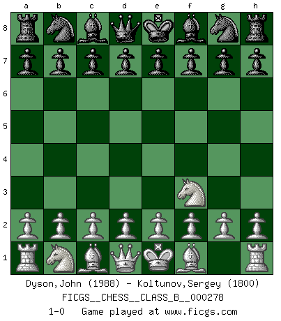 Last move : 1-0 2018 July 21 20:9:42 [Event "FICGS__CHESS__CLASS_B__000278"] [Site "FICGS"] [Date "2018.06.11"] [Round "1"] [White "Dyson,John"] [Black "Koltunov,Sergey"] [Result "1-0"] [WhiteElo "1988"] [BlackElo "1800"] 1.Nf3 1-0 This chess game has been lost on time (started : 2018.06.11 2:38:7) Reti Opening Player White won this chess game. Follow this game move after move (download)Methodical thinking is of more use in Chess than inspiration. (C. J. S. Purdy) Bogoljubow: Matt in vier Zügen! Tartakower: Ich verbitte mir jede Belästigung! (Savielly Grigorievitsch Tartakower) a manera como él juega al Ajedrez, demuestra la completa naturaleza de un hombre. (Stanley Ellin) Je fais ceci parce que dans cinquante coups j'obtiendrai cela; je m'appelle Mikhail Moisevitch Botvinnik. (Botvinnik) Experiences are the keys to life. (Daniel Parmet)
