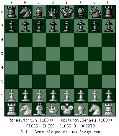 Last move : 0-1 2018 July 21 8:6:14 [Event "FICGS__CHESS__CLASS_B__000278"] [Site "FICGS"] [Date "2018.06.11"] [Round "1"] [White "Rojas,Martin"] [Black "Koltunov,Sergey"] [Result "0-1"] [WhiteElo "1800"] [BlackElo "1800"] 0-1 This chess game has been lost on time (started : 2018.06.11 2:38:7) Player Black won this chess game. Follow this game move after move (download)On the chessboard, lies and hypocrisy do not survive long. (Emanuel Lasker) Wer mein Gambit spielt, muß bereit sein, alle Brücken hinter sich abzubrechen. Es verändert den ganzen Menschen. Es wirkt wie ein Zauberstab und fördert verkümmerte, gute Charakter- eigenschaften wieder zu Tage. (Emil Joseph Diemer) Yo siempre he tenido un ligero sentimiento de lástima por una persona que no tiene conocimiento del Ajedrez. (Siegbert Tarrasch) En blitz, le Cavalier l'emporte sur le Fou. (Vlastimil Hort) History is the quarrels of popes and kings, with wars or pestilences in every page; the men all so good for nothing, and hardly any women at all. (Jane Austen)