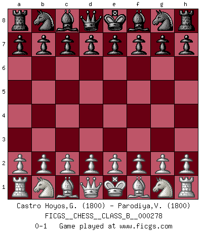 Last move : 0-1 2018 July 21 8:6:14 [Event "FICGS__CHESS__CLASS_B__000278"] [Site "FICGS"] [Date "2018.06.11"] [Round "1"] [White "Castro Hoyos,Gerardo"] [Black "Parodiya,Vikas"] [Result "0-1"] [WhiteElo "1800"] [BlackElo "1800"] 0-1 This chess game has been lost on time (started : 2018.06.11 2:38:7) Player Black won this chess game. Follow this game move after move (download)Is Bobby Fischer quite sane ? (Salo Flohr) Ich suche im Schach immer etwas Eigenes. Riskantes Spiel im Stile schachlicher Musketiere ist nicht meine Sache, auch wenn es vielen Freunden scharfer Wendungen gefällt. (Anatoly Karpov) Yo nunca en mi vida he jugado la Defensa Francesa, que viene siendo la más aburrida de todas las Aperturas. (Wilhelm Steinitz) Fischer est le meilleur joueur du monde et Karpov n'est qu'un joueur de bistrot. (Garry Kasparov, agé de 16 ans) The Internet is the world's largest library. It's just that all the books are on the floor. (John Allen Paulos)