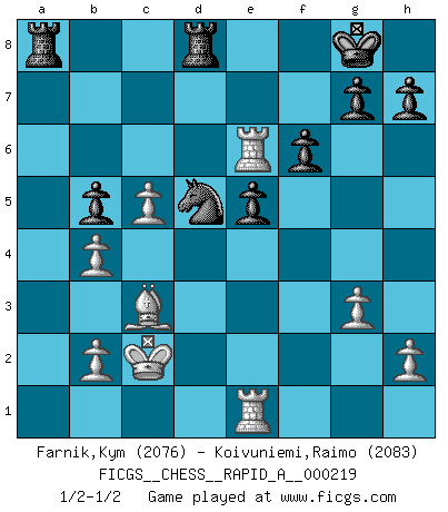 Last move : 1/2-1/2 2018 July 27 4:20:59 [Event "FICGS__CHESS__RAPID_A__000219"] [Site "FICGS"] [Date "2018.06.11"] [Round "1"] [White "Farnik,Kym"] [Black "Koivuniemi,Raimo"] [Result "1/2-1/2"] [WhiteElo "2076"] [BlackElo "2083"] 1.Nf3 c5 2.c4 Nf6 3.Nc3 Nc6 4.d4 cxd4 5.Nxd4 e6 6.g3 Qb6 7.Nb3 Ne5 8.e4 Bb4 9.Qe2 d6 10.Bd2 O-O 11.O-O-O a5 12.f4 a4 13.fxe5 axb3 14.a3 dxe5 15.axb4 Ra1+ 16.Nb1 Qa6 17.Qd3 b5 18.Qxb3 Bb7 19.c5 Nxe4 20.Be3 Nf6 21.Rd6 Qa8 22.Rg1 Bd5 23.Qc2 Ba2 24.Bg2 Bxb1 25.Bxa8 Bxc2 26.Kxc2 R1xa8 27.Bd2 Nd5 28.Re1 f6 29.Rxe6 Rfd8 30.Bc3 1/2-1/2 Reti Opening Kingside Castling by player Black (move 10) Queenside Castling by player White (move 11) This chess game ended in a draw. Follow this game move after move (download)I play correspondence chess because it is both art and science while chess is art only. (A player at FICGS) Die jungen Leute sollen verstehen, dass sie noch etwas von mir lernen können und müssen. (Viktor Kortschnoi) Una partida de Ajedrez se divide en 3 etapas: la primera cuando piensas que tienes la ventaja, la segunda cuando crees que tienes la ventaja y la tercera... ¡cuando te das cuenta que vas a perder!. (Savielly Tartakower) Même si l'adversaire joue le coup analysé précédemment, recommencez l'analyse en voyant la nouvelle position. Première règle de Blumenfeld A proverb is a short sentence based on long experience. (Miguel de Cervantes)