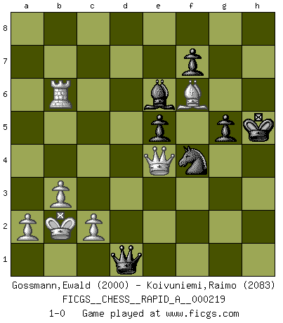 Last move : 1-0 2018 August 3 16:30:41 [Event "FICGS__CHESS__RAPID_A__000219"] [Site "FICGS"] [Date "2018.06.11"] [Round "1"] [White "Gossmann,Ewald"] [Black "Koivuniemi,Raimo"] [Result "1-0"] [WhiteElo "2000"] [BlackElo "2083"] 1.e4 c5 2.Nf3 Nc6 3.d4 cxd4 4.Nxd4 Nf6 5.Nc3 d6 6.Bg5 a6 7.Qd2 e6 8.O-O-O h6 9.Be3 Be7 10.f3 Qc7 11.g4 Bd7 12.h4 Ne5 13.Qg2 g6 14.g5 hxg5 15.hxg5 Rxh1 16.Qxh1 Nh5 17.Kb1 b5 18.f4 Ng4 19.Bg1 b4 20.e5 Rd8 21.exd6 Bxd6 22.Ne4 Bxf4 23.Be2 e5 24.Nb3 Kf8 25.Rd6 Rc8 26.Bc5 Kg7 27.Qd1 Bf5 28.Bxg4 Bxe4 29.Bxc8 Qxc8 30.Bxb4 Bxg5 31.Nc5 Bf5 32.Qd5 Bf6 33.Rxa6 Qb8 34.Nb7 Be6 35.Qc6 g5 36.Rb6 Qh8 37.Nd6 Nf4 38.Ne8+ Kh6 39.Qh1+ Kg6 40.Qe4+ Kh5 41.Be7 Qxe8 42.Bxf6 Qd7 43.b3 Qd1+ 44.Kb2 1-0 Sicilian defense Queenside Castling by player White (move 8) Player White won this chess game. Follow this game move after move (download)Place the contents of the Chess box in a hat, shake them up vigorously, pour them on the board from a height of two feet, and you get the style of Steinitz. (H. E. Bird) Habe Mut, dich deines eigenen Verstandes zu bedienen. (Immanuel Kant) El Ajedrez era la lengua materna de Capablanca. (Reti) Nous sommes les pions de la mystérieuse partie d'Echecs jouée par Dieu. Il nous déplace, nous arrête, nous pousse encore, puis nous lance un à un dans la boîte du Néant. Epitaphe sur la tombe de David Janowsky (1868-1927). Computers have lots of memory but no imagination. (Anonymous)