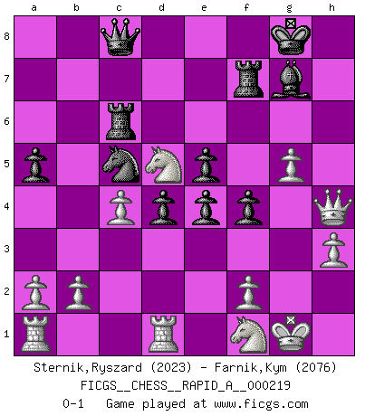 Last move : 0-1 2018 July 10 19:23:43 [Event "FICGS__CHESS__RAPID_A__000219"] [Site "FICGS"] [Date "2018.06.11"] [Round "1"] [White "Sternik,Ryszard"] [Black "Farnik,Kym"] [Result "0-1"] [WhiteElo "2023"] [BlackElo "2076"] 1.e4 c5 2.Nf3 d6 3.d4 cxd4 4.Nxd4 Nf6 5.Nc3 a6 6.Be2 e5 7.Nf5 d5 8.Bg5 d4 9.Bxf6 Qxf6 10.Nd5 Qd8 11.Ng3 g6 12.O-O Bg7 13.h3 O-O 14.c4 Be6 15.Qb3 Nd7 16.Qxb7 a5 17.Qc6 Re8 18.Rfd1 h5 19.Bf3 Rc8 20.Qa4 Nc5 21.Qc2 h4 22.Nf1 f5 23.Qe2 fxe4 24.Bg4 Bf5 25.Bxf5 gxf5 26.Qh5 Rf8 27.g4 f4 28.Qg6 Qe8 29.Qg5 Rf7 30.Qxh4 Rc6 31.g5 Qc8 0-1 Comment by player 2 : Kym Farnik : Thanks for the game Sicilian : Najdorf, Opovcensky variation Kingside Castling by player White (move 12) Kingside Castling by player Black (move 13) Player Black won this chess game. Follow this game move after move (download)A Chess game is a dialogue, a conversation between a player and his opponent. Each move by the opponent may contain threats or be a blunder, but a player cannot defend against threats or take advantage of blunders if he does not first ask himself: What is my opponent planning after each move ? (Bruce A. Moon) Karpov ist ein Museumsstück. (Garry Kasparov) Si tu oponente no puede hacer nada activo, entonces no apures la posición; En vez de eso, dejalo estar sentado ahí, sufriendo y rogandote por un empate. (Jeremy Silman) Les échecs sont un jeu terrible. Si vous n'avez pas le centre, votre adversaire a une position plus libre. Par contre, si vous avez le centre, alors vous avez vraiment quelque chose pour laquelle vous inquiéter ! (Siegbert Tarrasch) A woman without a man is like a fish without a bicycle. (Gloria Steinem)