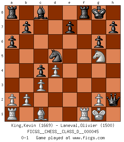 Last move : 0-1 2007 June 2 21:56:55 [Event "FICGS__CHESS__CLASS_D__000045"] [Site "FICGS"] [Date "2007.05.10"] [Round "1"] [White "King,Kevin"] [Black "Laneval,Olivier"] [Result "0-1"] [WhiteElo "1669"] [BlackElo "1500"] 1.e4 c5 2.Nc3 Nc6 3.f4 g6 4.Nf3 Bg7 5.Bb5 Nd4 6.O-O Nxb5 7.Nxb5 d5 8.exd5 a6 9.Nc3 Nf6 10.d4 c4 11.Ne5 Nxd5 12.Ne4 Qc7 13.Qe1 O-O 14.c3 f6 15.Nf3 Bh6 16.Qh4 Bxf4 17.Nfg5 fxg5 18.Nxg5 Bxh2+ 19.Qxh2 Qxh2+ 0-1 Sicilian : Grand Prix attack Kingside Castling by player White (move 6) Kingside Castling by player Black (move 13) Player Black won this chess game. Follow this game move after move (download)It is the aim of the modern school, not to treat every position according to one general law, but according to the principle inherent in the position. (Richard Reti) Ich glaube nicht an Psychologie, ich glaube an gute Züge. (Robert James Fischer) Por esta medida (el intervalo entre Fischer y sus contemporaneos), yo le considero el mas grande campeón mundial. (Garry Kasparov) La solitude du joueur d'Echecs à l'approche du mat est semblable à celle du condamné. (Francis Szpiner) Strategy without tactics is the slowest route to victory. Tactics without strategy is the noise before defeat. (Sun Tzu)
