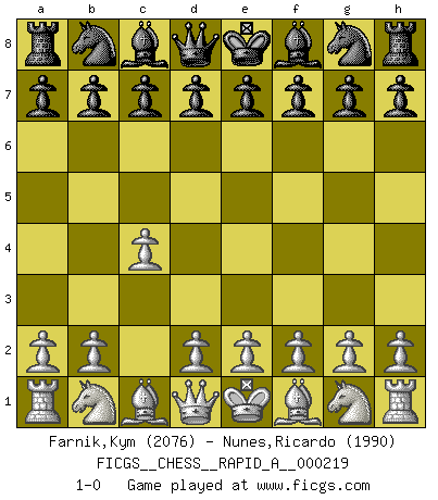 Last move : 1-0 2018 July 12 7:19:16 [Event "FICGS__CHESS__RAPID_A__000219"] [Site "FICGS"] [Date "2018.06.11"] [Round "1"] [White "Farnik,Kym"] [Black "Nunes,Ricardo"] [Result "1-0"] [WhiteElo "2076"] [BlackElo "1990"] 1.c4 1-0 This chess game has been lost on time (started : 2018.06.11 23:54:14) English Opening Player White won this chess game. Follow this game move after move (download)Mistrust is the most necessary characteristic of the Chess player. (Siegbert Tarrasch) Schach ist gnadenlos. Du mußt bereit sein zu töten. (Nigel Short) Cada Peón es una Reina en potencia. (James Mason) Tout change constamment, y compris dans le monde des Echecs. (Botvinnik) If everyone is thinking alike, then somebody isn't thinking. (US General George S. Patton)