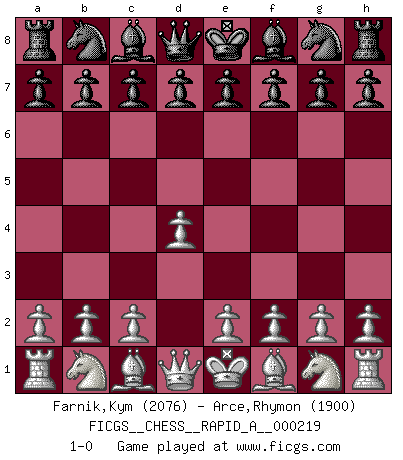 Last move : 1-0 2018 July 12 7:19:16 [Event "FICGS__CHESS__RAPID_A__000219"] [Site "FICGS"] [Date "2018.06.11"] [Round "1"] [White "Farnik,Kym"] [Black "Arce,Rhymon"] [Result "1-0"] [WhiteElo "2076"] [BlackElo "1900"] 1.d4 1-0 This chess game has been lost on time (started : 2018.06.11 23:54:14) Queen's pawn Player White won this chess game. Follow this game move after move (download)He who fears an isolated Queen's Pawn should give up Chess. (Siegbert Tarrasch) Das Zentrum ist der Balkan des Schachbretts - Kriegshandlungen können in jedem Moment ausbrechen. (Aaron Nimzowitsch) No hay precio que sea tan grande por la cabellera del Rey enemigo. (Koblentz) Il s'avisa de me proposer d'apprendre les échecs qu'il jouait un peu... me voilà forcené des échecs. J'achète un échiquier, je m'enferme dans ma chambre, j'y passe des jours et des nuits à vouloir apprendre par cur toutes les parties. (Jean-Jacques Rousseau, Confessions) Watch your thoughts; they become words. Watch your words; they become actions. Watch your actions; they become habits. Watch your habits; they become character. Watch your character; it becomes your destiny. (Frank Outlaw)