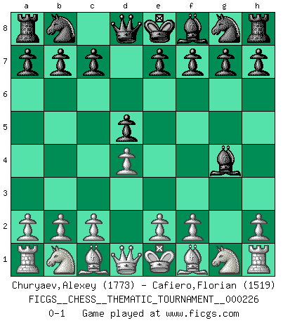 Last move : 0-1 2018 September 1 23:30:57 [Event "FICGS__CHESS__THEMATIC_TOURNAMENT__000226"] [Site "FICGS"] [Date "2018.06.13"] [Round "1"] [White "Churyaev,Alexey"] [Black "Cafiero,Florian"] [Result "0-1"] [WhiteElo "1773"] [BlackElo "1519"] 1.d4 d5 2.g4 Bxg4 0-1 This chess game has been lost on time (started : 2018.06.13 2:19:13) Queen's pawn game Player Black won this chess game. Follow this game move after move (download)We like to think. (Gary Kasparov) Das Schach hält seine Meister in eigenen Banden, Fesseln; auf vielerlei Weise formt es ihren Geist, so dass die innere Freiheit selbst des Stärksten beeinflusst wird. (Albert Einstein) Un jugador que trata de regresar una movida en el Ajedrez es un futuro carterista. (Richard Fenton) Horreur, mais aussi harmonie suprême : qu'y avait-il en effet au monde en dehors des échecs ? Le brouillard, l'inconnu, le non-être... (Vladimir Nabokov) You can't play chess if you're groggy from pills. (Anatoly Karpov)