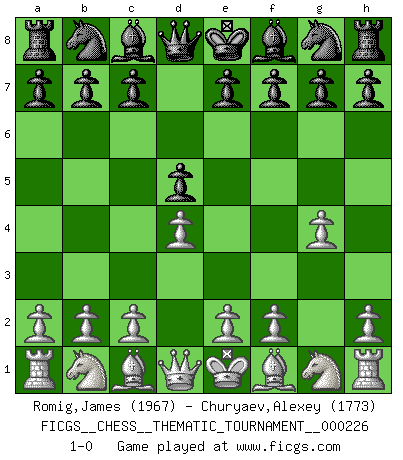 Last move : 1-0 2018 July 23 8:18:5 [Event "FICGS__CHESS__THEMATIC_TOURNAMENT__000226"] [Site "FICGS"] [Date "2018.06.13"] [Round "1"] [White "Romig,James"] [Black "Churyaev,Alexey"] [Result "1-0"] [WhiteElo "1967"] [BlackElo "1773"] 1.d4 d5 2.g4 1-0 This chess game has been lost on time (started : 2018.06.13 2:19:13) Queen's pawn game Player White won this chess game. Follow this game move after move (download)You are for me the Queen on d8 and I am the Pawn on d7 !! (Eduard Gufeld) Ein Großmeister muß tausende Partien in seinem Kopf speichern, denn diese sind für Ihn, was die Worte der Muttersprache für gewöhnliche Leute sind, oder Noten für Musiker... (Garry Kasparov) Las combinaciones han sido siempre el aspecto más intrigante del Ajedrez. Los Maestros las buscan, el público las aplauden, los críticos las alaban. La razón se debe a que las combinaciones hacen posible que el Ajedrez sea más que un ejercicio matemático con una carencia de vida. Ellas son la poesía del juego, son del Ajedrez lo que la melodía es de la música. Ellas representan el triunfo de la mente sobre la materia. (Reuben Fine) Mon pion favori sur ma case favorite ! Bronstein en parlant d'un coup de pion en h5 quand il avait les Noirs. Men should grow up. - Yeah. And dogs should stop licking themselves. It's not gonna happen. (Gregory House to Dr. Cameron, House M.D.)
