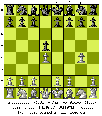 Last move : 1-0 2018 July 23 8:18:5 [Event "FICGS__CHESS__THEMATIC_TOURNAMENT__000226"] [Site "FICGS"] [Date "2018.06.13"] [Round "1"] [White "Zmolil,Josef"] [Black "Churyaev,Alexey"] [Result "1-0"] [WhiteElo "1591"] [BlackElo "1773"] 1.d4 d5 2.g4 1-0 This chess game has been lost on time (started : 2018.06.13 2:19:13) Queen's pawn game Player White won this chess game. Follow this game move after move (download)Not all artists are Chess players, but all Chess players are artists. (Marcel Duchamp) Sicherlich können nur Meister einen Stil haben. Daß ein nicht-Meister auch nur ein einziges Mal in seinem Leben eine Partie folgerecht durchführte, habe ich niemals bemerkt. (Emanuel Lasker) Los problemas de Ajedrez exigen del compositor las mismas virtudes que caracterizan todo el arte de valor: originalidad, invención, concisión, armonía, complejidad e insinceridad explendida. (Vladimir Nabokov) On est toujours la mazette de quelqu'un d'autre. (Anonyme) Go and wake up your luck. (Persian saying)