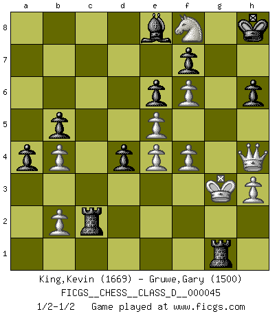 Last move : 1/2-1/2 2007 September 3 3:42:6 [Event "FICGS__CHESS__CLASS_D__000045"] [Site "FICGS"] [Date "2007.05.10"] [Round "1"] [White "King,Kevin"] [Black "Gruwe,Gary"] [Result "1/2-1/2"] [WhiteElo "1669"] [BlackElo "1500"] 1.e4 c5 2.Nc3 e6 3.f4 d5 4.Nf3 d4 5.Ne2 Qc7 6.g3 Nf6 7.d3 Be7 8.Bg2 O-O 9.O-O Nc6 10.a3 Bd7 11.Qe1 Rfd8 12.h3 Rac8 13.Qf2 a5 14.Bd2 a4 15.g4 Be8 16.Ng3 b5 17.g5 Nd7 18.e5 c4 19.Ne4 Nc5 20.Nf6+ gxf6 21.gxf6 Bf8 22.Qg3+ Kh8 23.Ng5 h6 24.Qh4 cxd3 25.cxd3 Nb3 26.Bb4 Nxb4 27.axb4 Nxa1 28.Be4 Qc1 29.Rxc1 Rxc1+ 30.Kf2 Rdc8 31.Nh7 Rc8c2+ 32.Kf3 Nb3 33.Nxf8 Nd2+ 34.Kg3 Nxe4+ 35.dxe4 Rg1+ 36.Kf3 Rf1+ 37.Kg3 Rg1+ 1/2-1/2 Sicilian : Closed Kingside Castling by player Black (move 8) Kingside Castling by player White (move 9) This chess game ended in a draw. Follow this game move after move (download)Nonsense was the last thing Fischer was interested in, as far as Chess was concerned. (Elie Agur) Schach ist Leben. (Robert James Fischer) Aquel que teme a un Peón de Reina aislado, debería de retirarse del Ajedrez. (Siegbert Tarrasch) 'L'échange des dames est un coup dur pour les deux adversaires...' Un journaliste lors d'une partie du match Spassky-Fischer Indecision is the key to flexibility. (Unknown)