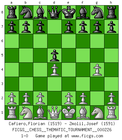 Last move : 1-0 2018 August 8 9:52:43 [Event "FICGS__CHESS__THEMATIC_TOURNAMENT__000226"] [Site "FICGS"] [Date "2018.06.13"] [Round "1"] [White "Cafiero,Florian"] [Black "Zmolil,Josef"] [Result "1-0"] [WhiteElo "1519"] [BlackElo "1591"] 1.d4 d5 2.g4 1-0 This chess game has been lost on time (started : 2018.06.13 2:19:13) Queen's pawn game Player White won this chess game. Follow this game move after move (download)I love all positions. Give me a difficult positional game, I will play it. But totally won positions, I cannot stand them. (Hein Donner) Sehr viele beherrschen heutzutage das große Einmalseins des Schachspiels und kennen sogar dessen Logarithmentafeln auswendig - deshalb sollte man hin und wieder zu beweisen trachten, dass zwei mal zwei auch fünf sein kann. (Mikhail Nekhemyevich Tal) El Ajedrez es tan inspirador que yo no creo que un buen jugador sea capaz de tener un pensamiento malo durante una partida. (Wilhelm Steinitz) D'abord les bases : Jouez et étudiez, puis étudiez et jouez, ensuite jouez et étudiez, puis étudiez et jouez. Deuxièmement : Donnez toujours le meilleur de vous-même ! (Ken Smith) Computer Science is no more about computers than astronomy is about telescopes. (Edsger W. Dijkstra)