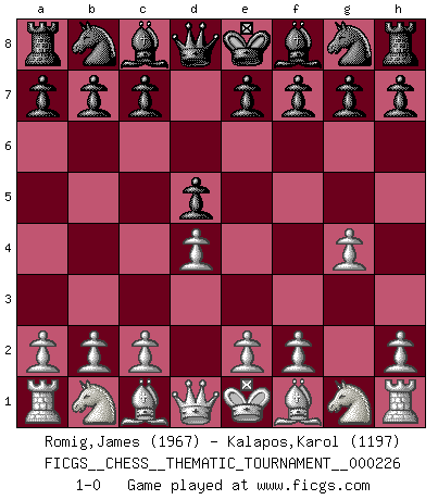 Last move : 1-0 2018 July 23 8:18:5 [Event "FICGS__CHESS__THEMATIC_TOURNAMENT__000226"] [Site "FICGS"] [Date "2018.06.13"] [Round "1"] [White "Romig,James"] [Black "Kalapos,Karol"] [Result "1-0"] [WhiteElo "1967"] [BlackElo "1197"] 1.d4 d5 2.g4 1-0 This chess game has been lost on time (started : 2018.06.13 2:19:13) Queen's pawn game Player White won this chess game. Follow this game move after move (download)A man without frontiers. He didn't divide the East and the West, he brought them together in their admiration for him. (Ljubomir Ljubojevic, about Bobby Fischer's death) Mein Gehirn das ist mein zweitwichtigstes Organ [Aus dem Film: Der Schläfer]. (Woody Allen) Cada Peón es potencialmente una Reina. (James Mason) Les échecs, c'est la lutte contre l'erreur. (Johannes Zukertort) I believe in luck. How else can you explain the success of those you dislike ? (Jean Cocteau)